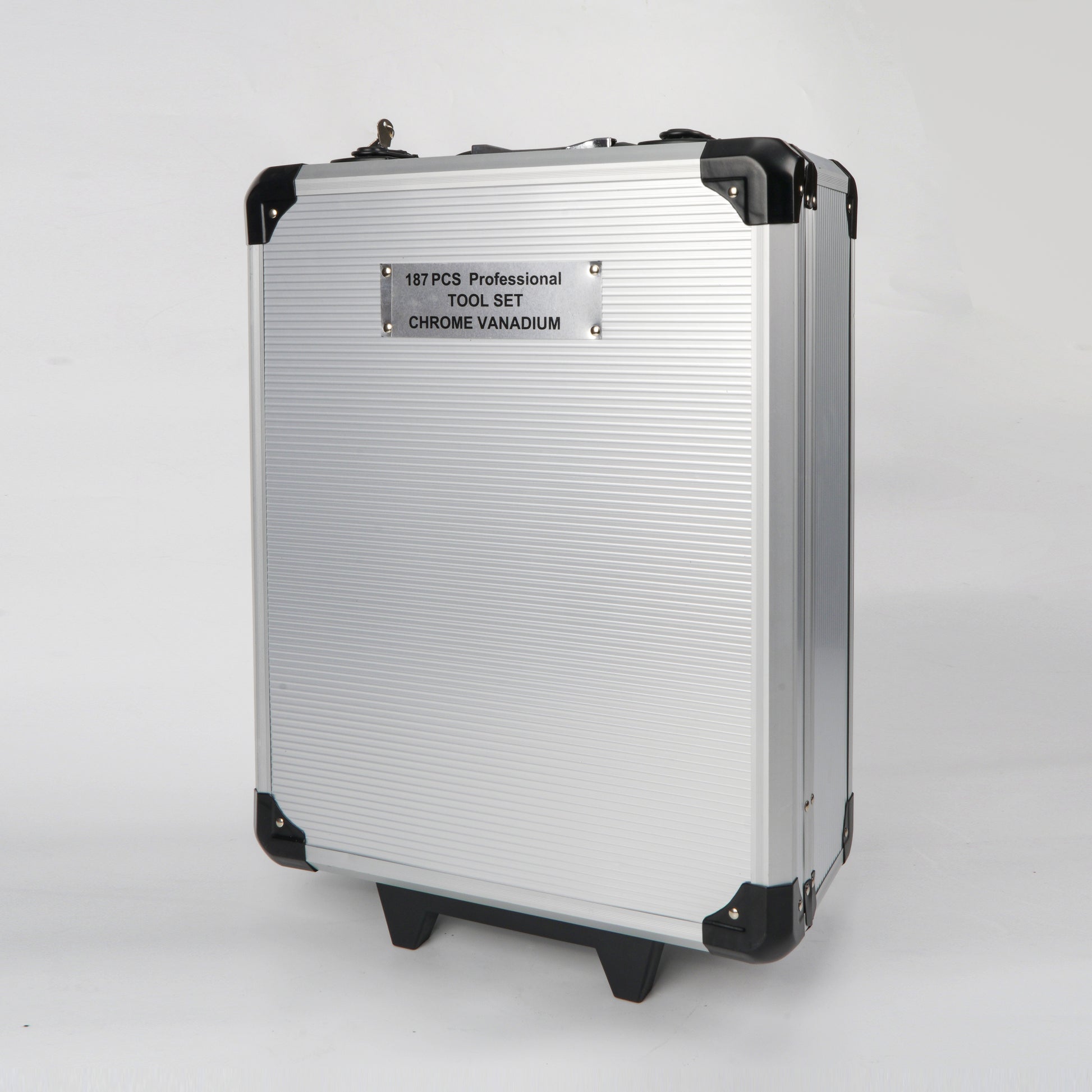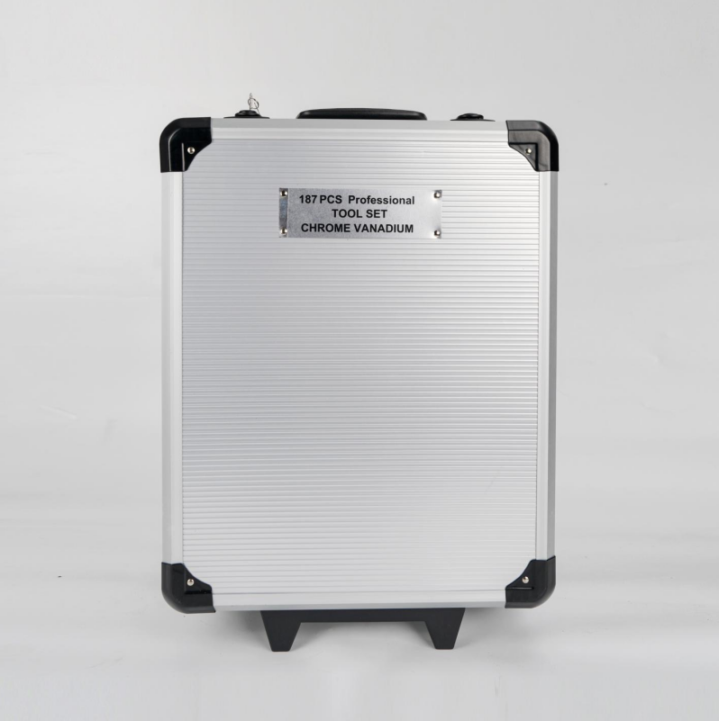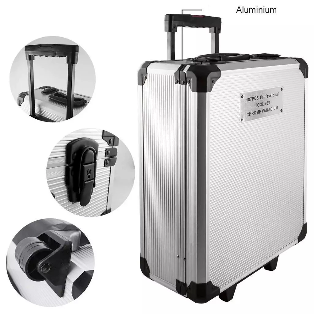 This 187-piece professional tool set comes in a durable aluminum suitcase with wheels for easy mobility. It includes wrenches, pliers, screwdrivers, sockets, and more, covering all essential repair and maintenance needs. Perfect for home, automotive, and workshop use with reliable quality and convenience.