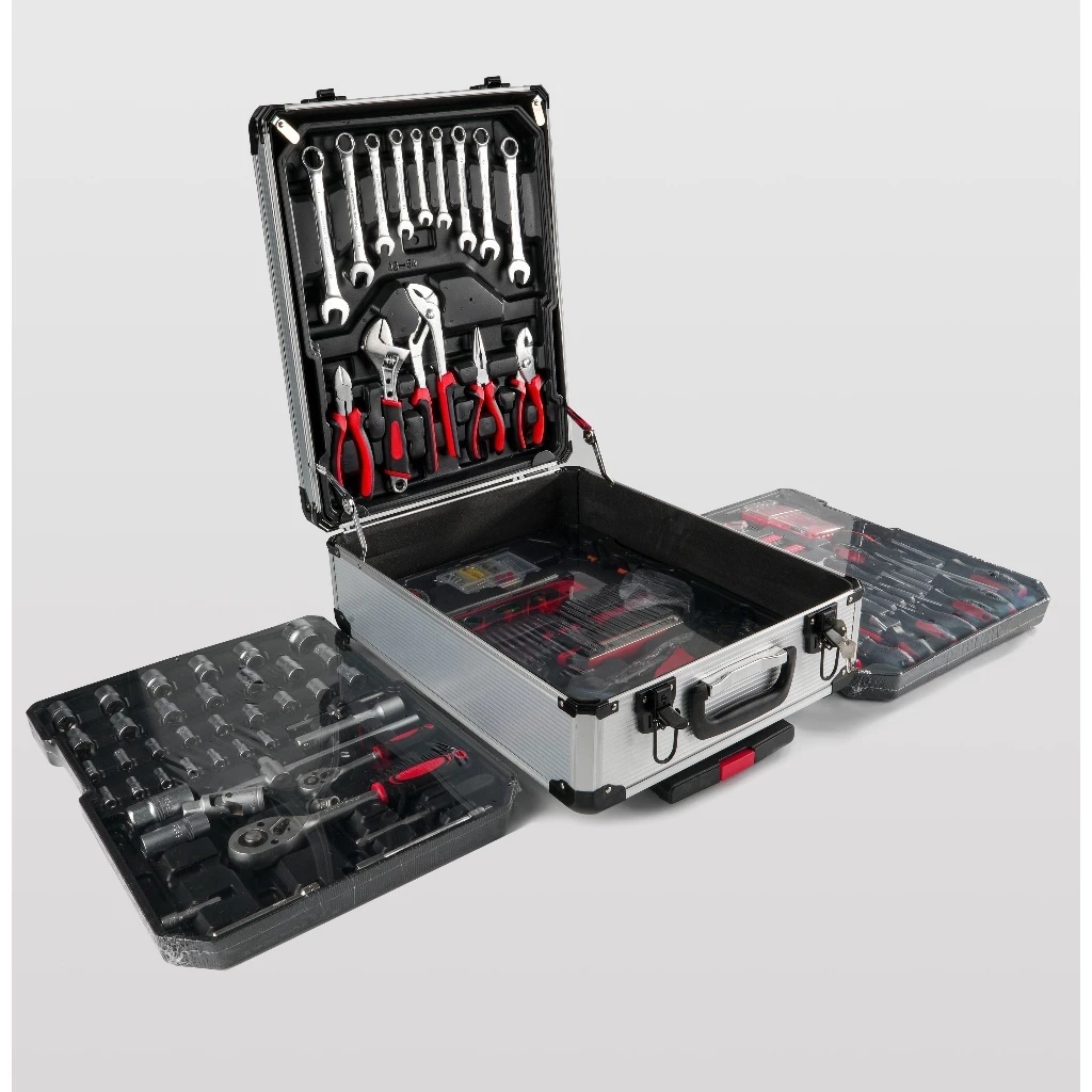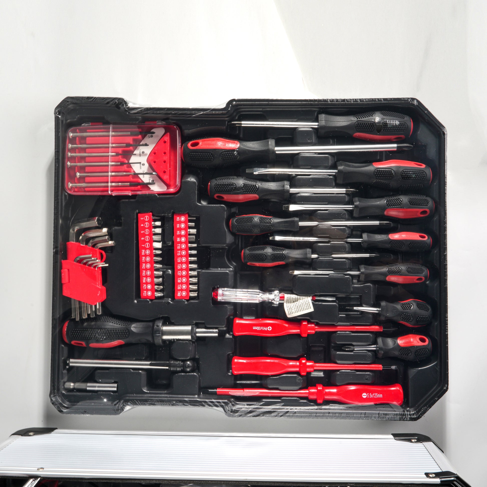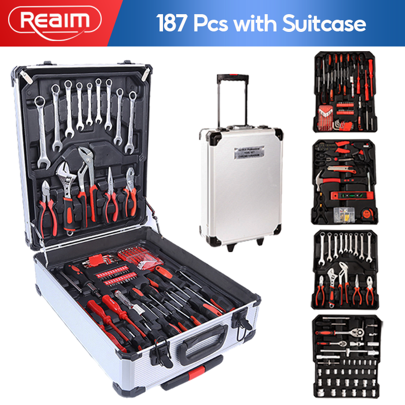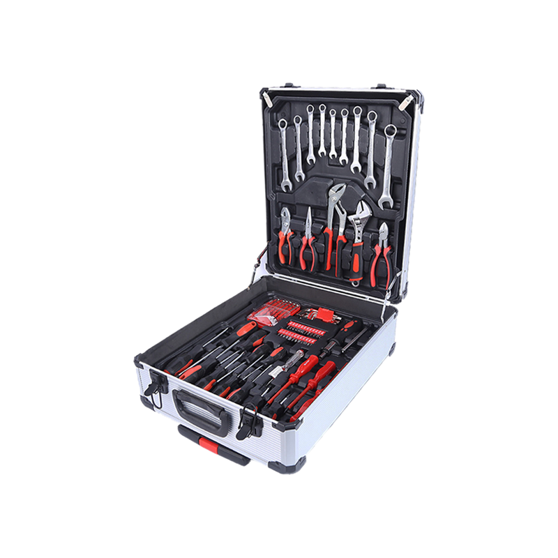 This 187-piece professional tool set comes in a durable aluminum suitcase with wheels for easy mobility. It includes wrenches, pliers, screwdrivers, sockets, and more, covering all essential repair and maintenance needs. Perfect for home, automotive, and workshop use with reliable quality and convenience.